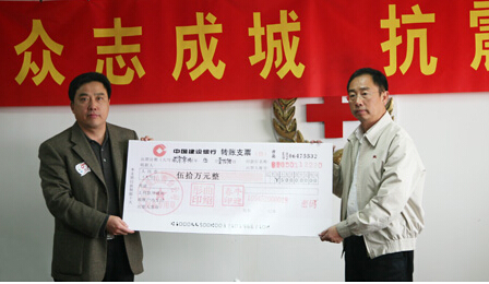 當(dāng)集團(tuán)倡議要為災(zāi)區(qū)捐建學(xué)校時(shí),各成員單位積極響應(yīng)。5月17日上午,集團(tuán)通過青島市紅十字會(huì)將籌集的第一筆善款50萬元人民幣捐給四川災(zāi)區(qū),用于災(zāi)后學(xué)校重建。青建集團(tuán)股份公司常務(wù)副總裁逄振輝代表集團(tuán)將捐款交到市政協(xié)副主席郄晉生手中。
